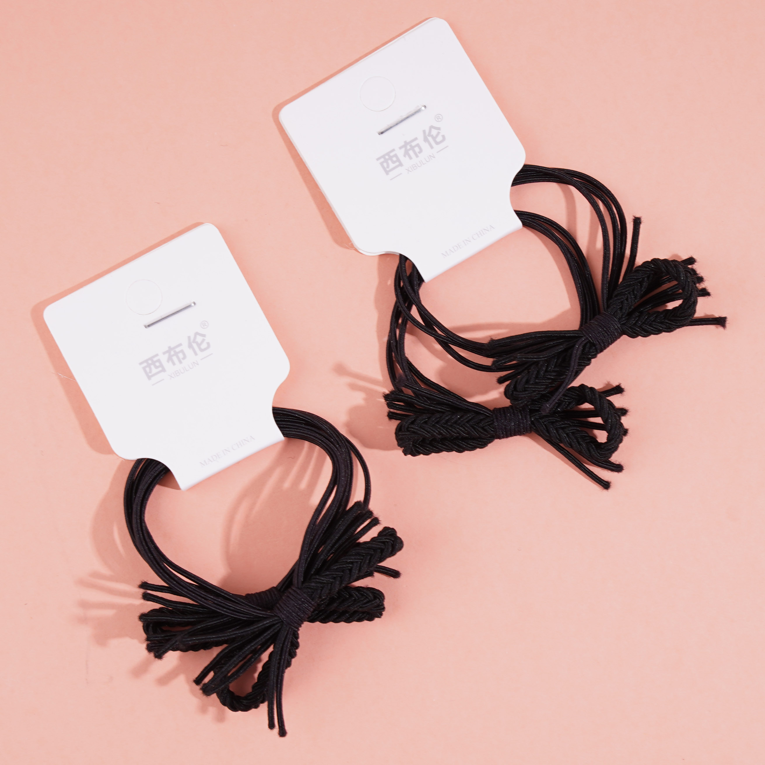 2 black ponytail elastics with a bow-shaped design